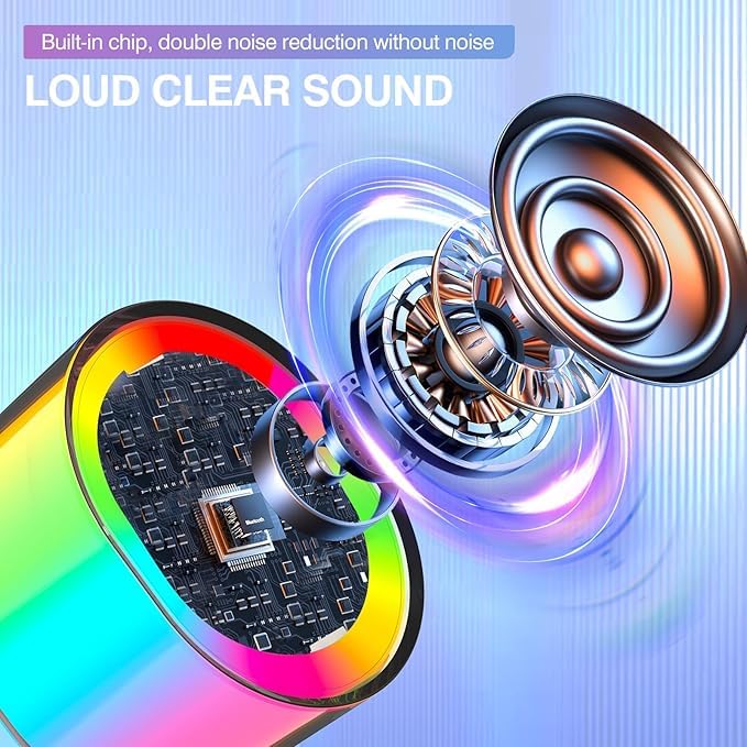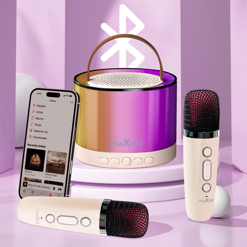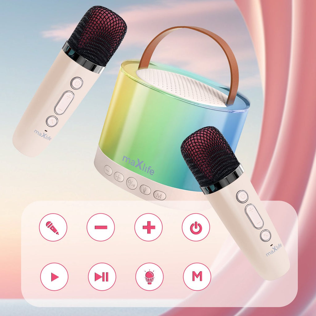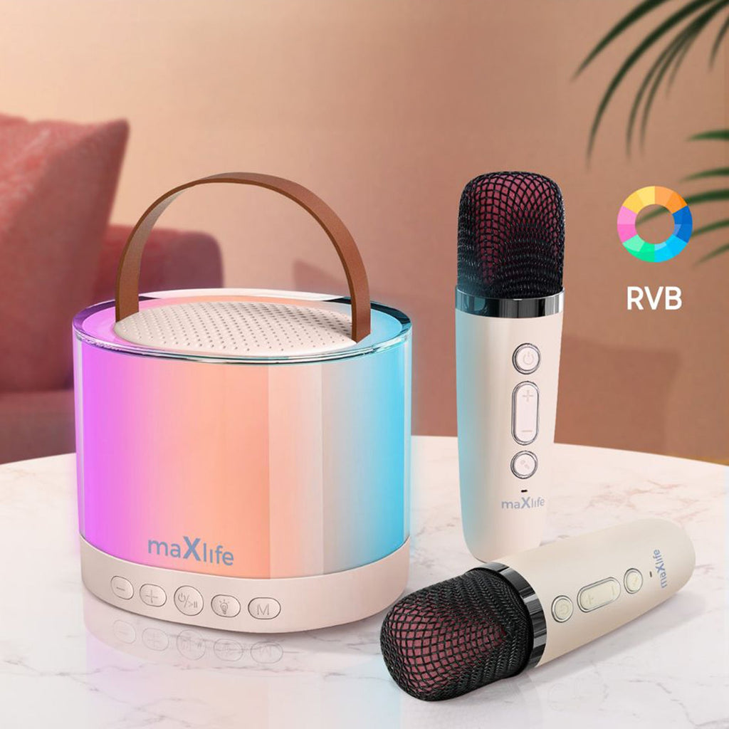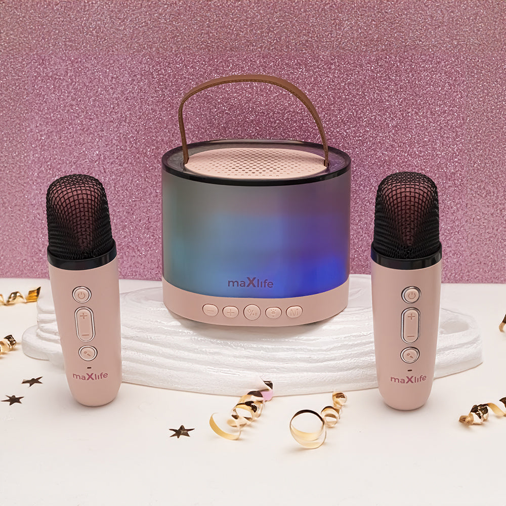 Spremenite vsak prostor v karaoke oder s tem kompletom, ki vključuje Bluetooth zvočnik 5W in 2 brezžična mikrofona. Kompaktna zasnova, dolgotrajna baterija in RGB svetlobni učinki zagotavljajo zabavo za vso družino in prijatelje. Povežite ga prek Bluetooth 5.0, SD kartice ali 3,5 mm priključka – in zapojte brez omejitev! 🎶