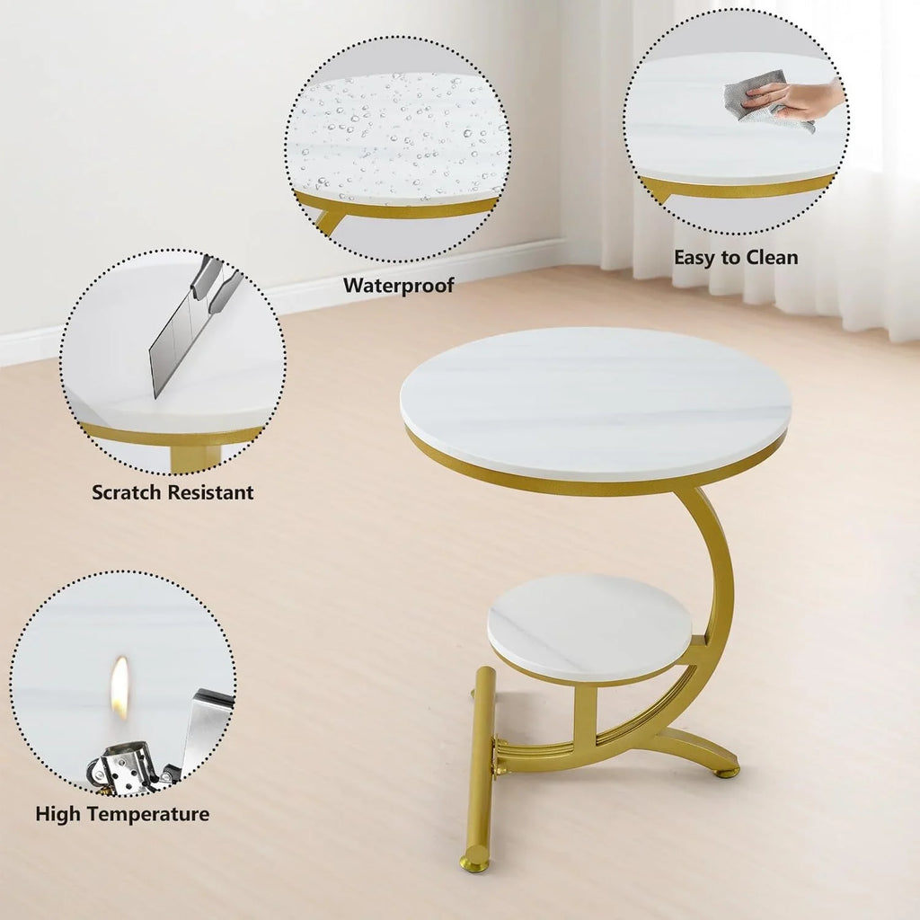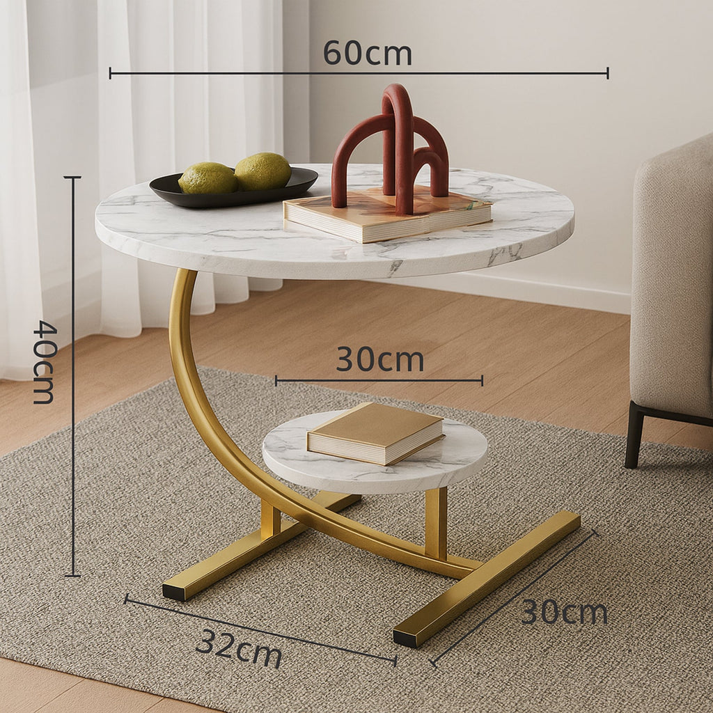 Moderna okrogla klubska mizica z dvojno površino popolno združuje funkcionalnost in razkošen dizajn. Zgornja plošča s premerom 60 cm ponuja dovolj prostora za serviranje, dekoracije ali delo na prenosniku, medtem ko manjša plošča s premerom 30 cm služi kot dodaten prostor za knjige, revije ali drobne predmete.