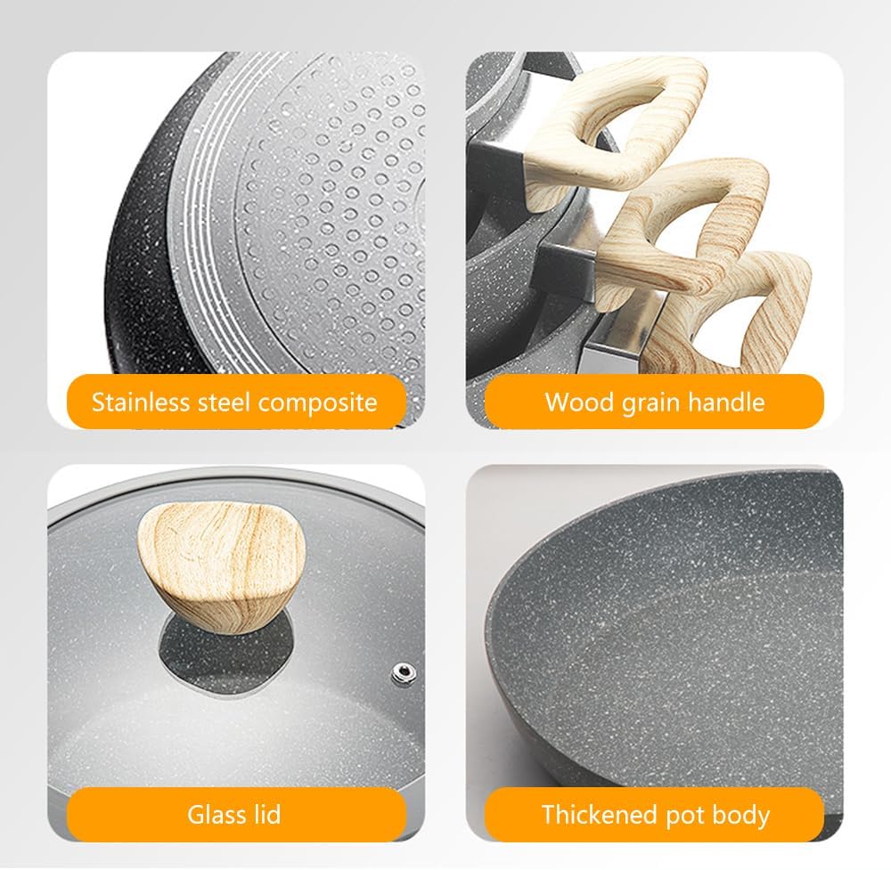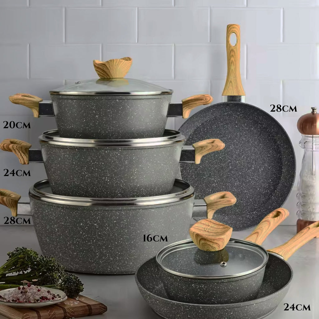 Elegancia és funkcionalitás egyben – ez a prémium kőedény készlet gránithatású bevonattal és fa hatású részletekkel a modern konyha elengedhetetlen része. Ideális mindennapi főzéshez, egészséges ételek elkészítéséhez és hosszú távú használathoz.