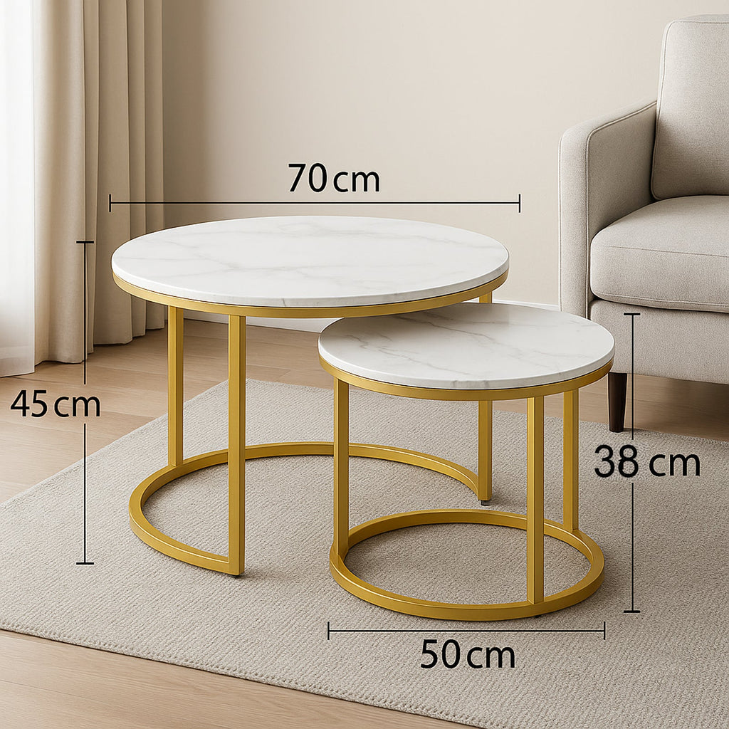 Dodajte pridih luksuza in praktičnosti s setom dveh okroglih mizic. Bela marmorna plošča in zlati kovinski okvir ustvarjata eleganten videz, manjša mizica pa se lepo pospravi pod večjo – popolna rešitev za pametno izrabo prostora.